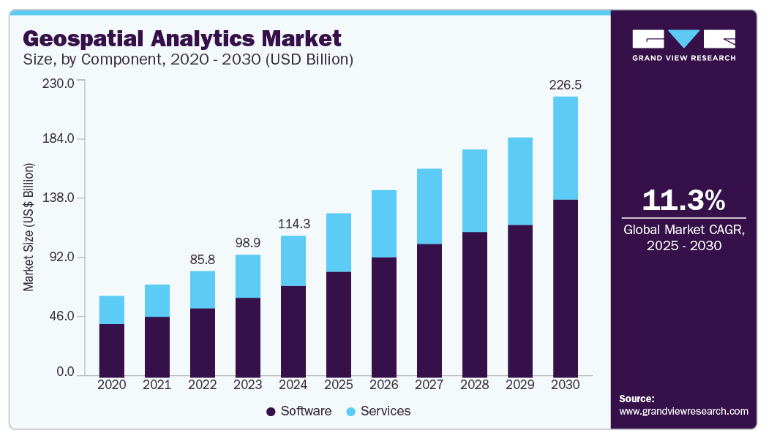 Industry forecasts reflect this shift. Analysts estimate the global geospatial analytics market at $114 billion in 2024, projecting growth to more than $226 billion by 2030 (Grand View Research, 2024). Another independent forecast places the market at $258 billion by 2032, driven by adoption across infrastructure, logistics, and smart-city applications (Fortune Business Insights, 2024). But as adoption accelerates, complexity rises: many organizations still struggle with data quality and context, which remain barriers to effective geospatial insight (Korem, 2025).
